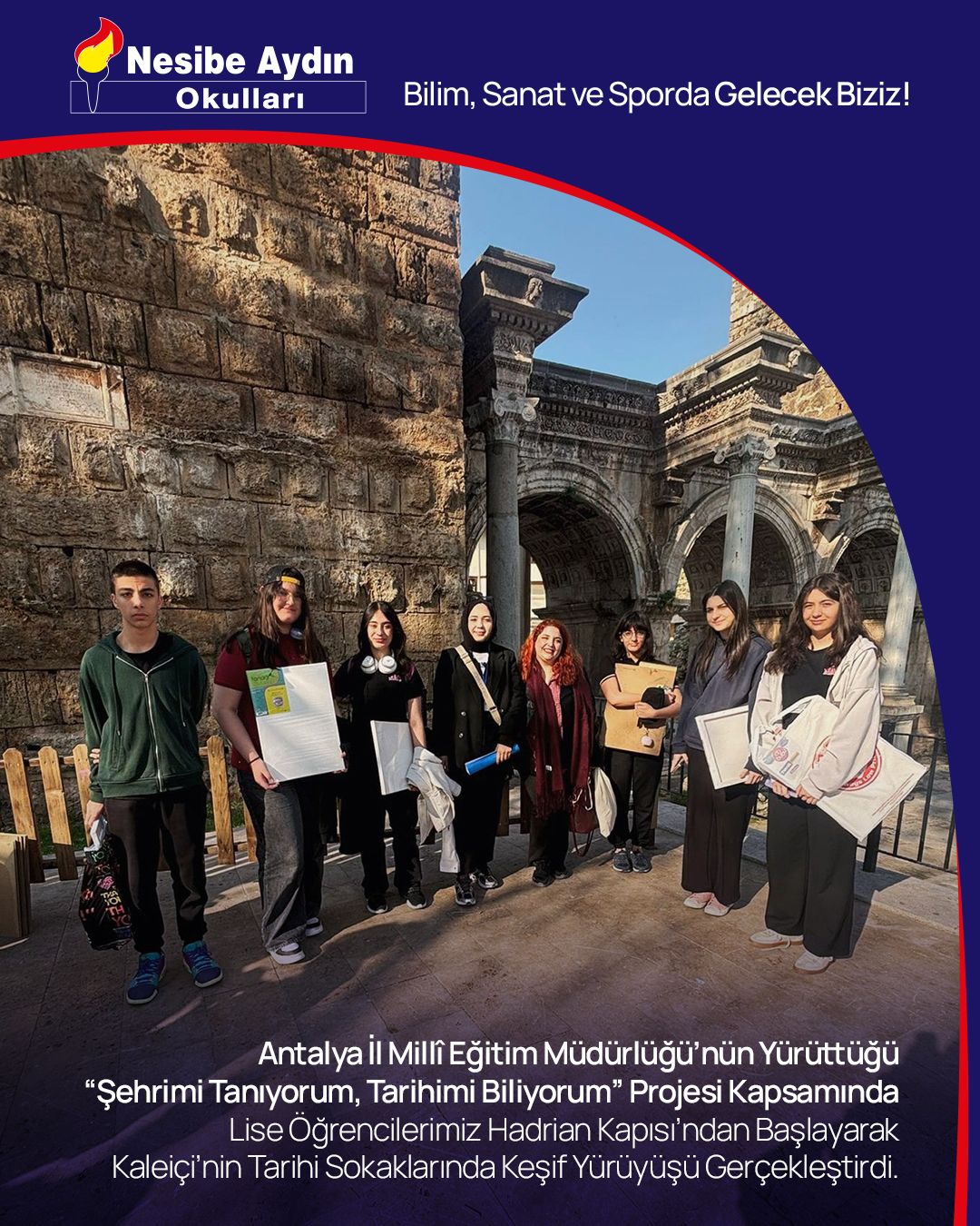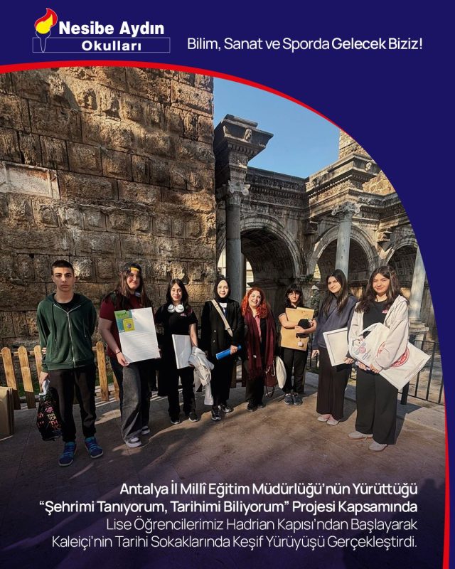 Antalya İl Millî Eğitim Müdürlüğü’nün yürüttüğü “Şehrimi Tanıyorum, Tarihimi Biliyorum” projesi kapsamında lise öğrencilerimiz, Hadrian Kapısı’ndan başlayarak Kaleiçi’nin tarihi sokaklarında keşif yürüyüşü gerçekleştirdi.